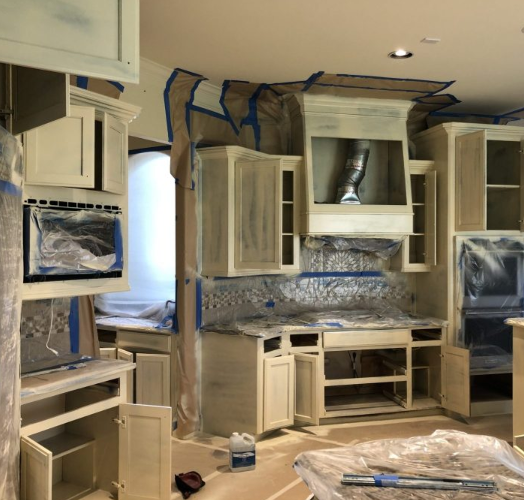 Kitchen cabinets color change, we first mask all areas and protect all spaces, then we sand all the surfaces, prime and spray two coats of paint so the finish result is flawless and smooth.